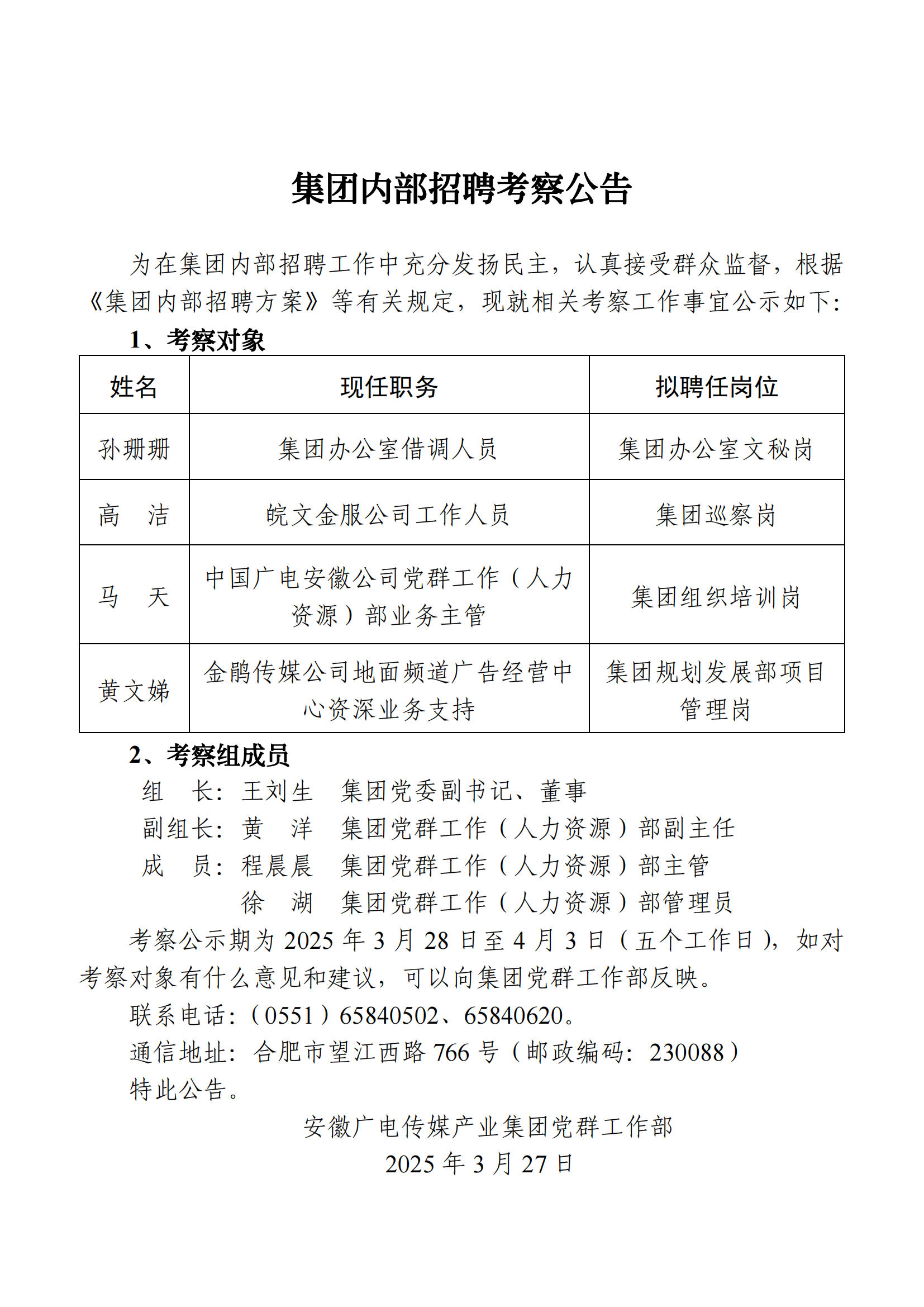 集团内部招聘考察公告