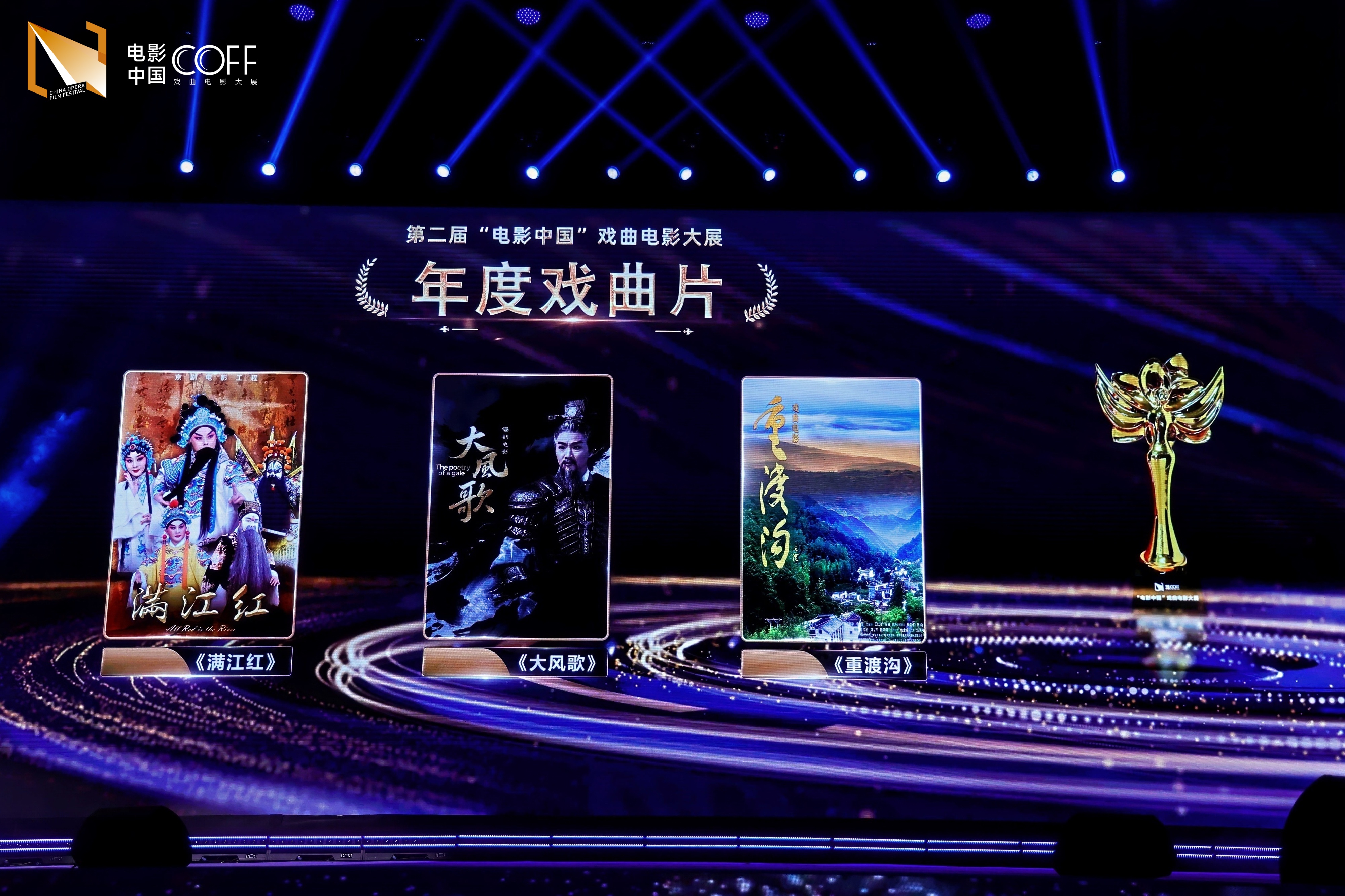 晚会现场名家荟萃,多项荣誉揭晓。京剧电影《满江红》、锡剧电影《大风歌》、豫剧电影《重渡沟》荣获“年度戏曲片”;表演艺术家于魁智凭借在《满江红》中成功塑造岳飞形象获“中国戏曲电影突出贡献特别荣誉”;《双蝶扇》《东吴郡主》等6部作品获“评委会特别荣誉”;《百年程派》《奔向幸福》等4部影片获“年度戏曲片提名”;《上岸》《南西厢》等10部作品获“年度戏曲短片”奖;另有7部作品获年度导演、年度编剧、年度男女主角、年度美术、年度剪辑、年度摄影等单项奖,24部作品获“优秀戏曲影片”奖。