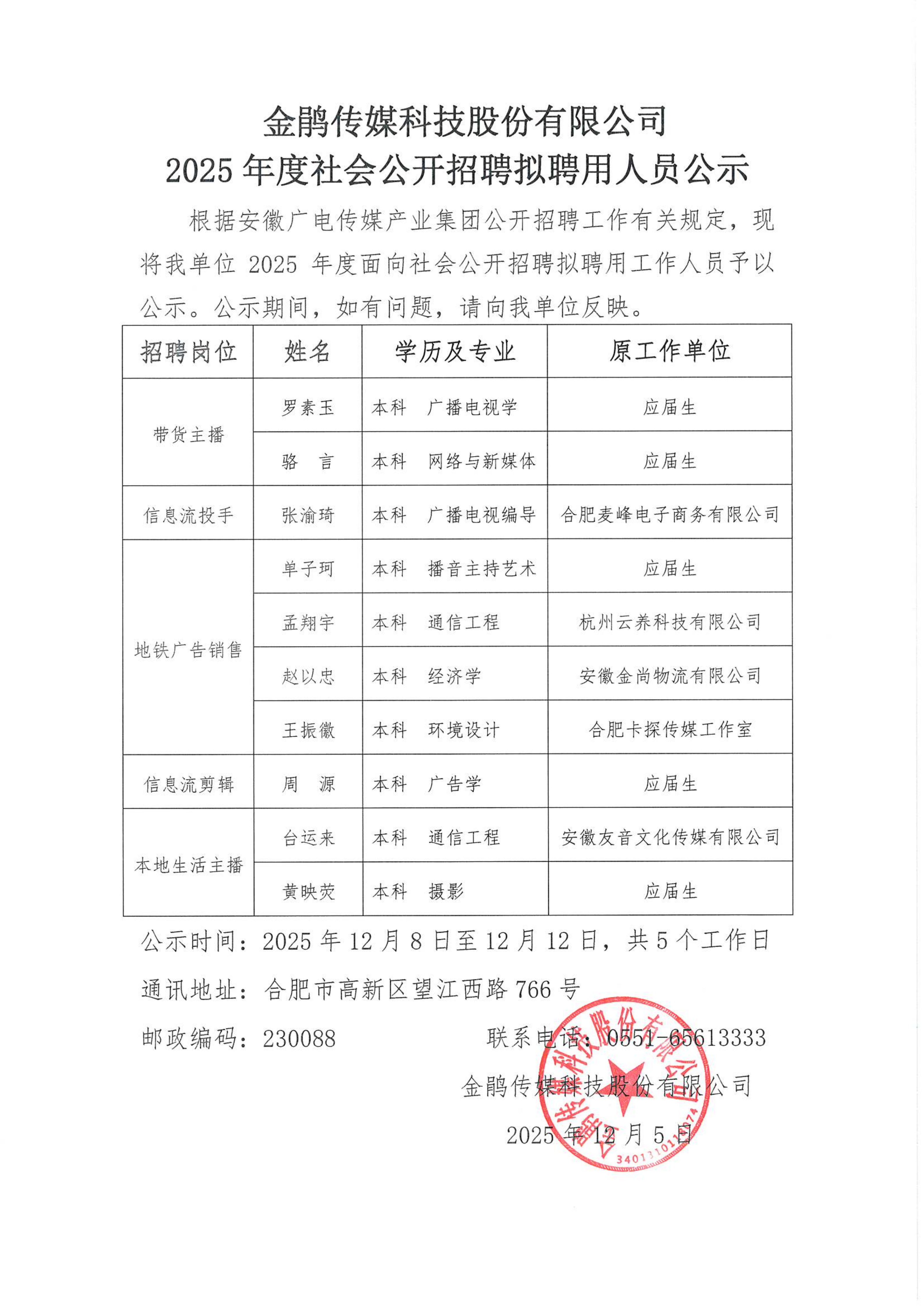 金鹃传媒科技股份有限公司2025年度社会公开招聘拟聘用人员公示